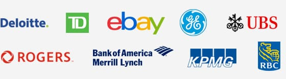 Deloitte, TD Canada, Ebay Canada, General Electric Canada, UBS Canada, Rogers, Bank of America Merrill Lynch, KPMG, RBC, Fresha, Door Dash, Eye Care Pro Canada, Instacart Canada, GoDaddy Canada, Bond University, OHS Canada, Mill Street Brewery, PIPSC Toronto, Elementary Teachers Federation of Ontario, CIMA Canada, Echelon, Northwood Family Office, Apotex, Counterpoint Engeneering, Largo Resources, Schoeck Canada, Mad Mexican, MARBL Toronto, REIGN Restaurant, Fixed Gear Brewing Co, The Consulate Restaurant, Kent Automotive, York Street Financial, Anderson Sinclair PC, Just Pure, NHP Consulting, Cannabis Compliance, Visible Media, Oddbee, DeeDeeCunningham, PFK Consulting, Funnel Conroy Ross, Richter International, Visual Antidote, CMAC Toronto, Pyramid Wealth Menagement, Redcliff Realty Management, Averbuch Wealth Management, KGHM, BDO Canada LLP.
